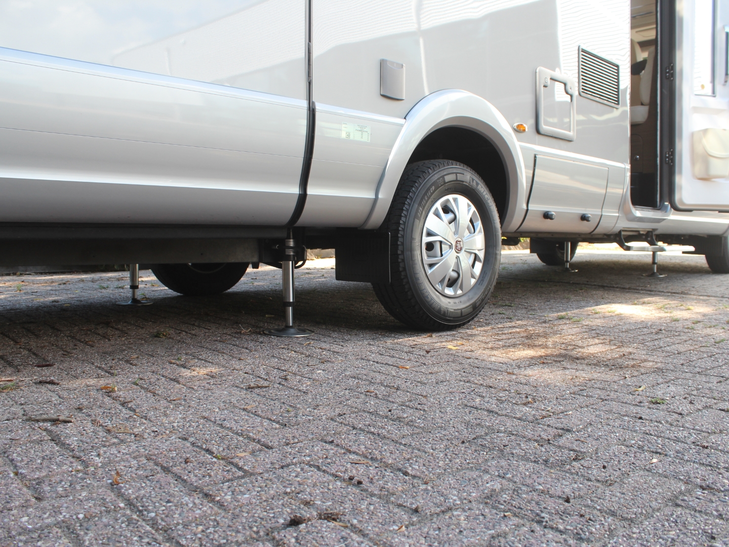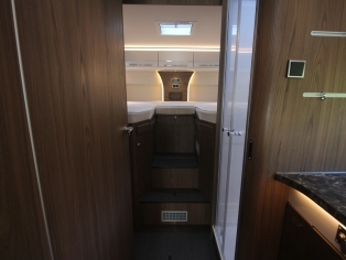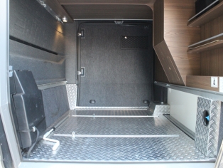 De camper heeft veel bergruimte in de ruime dubbele bodem bereikbaar dmv. verschillende luiken in de vloer en diverse kleppen buitenkant. Het bevat tevens een grote garage, met aan beide zijden een grote deur, waarin uw fietsen en bagage veilig binnen geplaatst kunnen worden.De 180 ltr schoon- en 150 ltr vuilwatertank bevinden zich in de (verwarmde) dubbele vloer.
