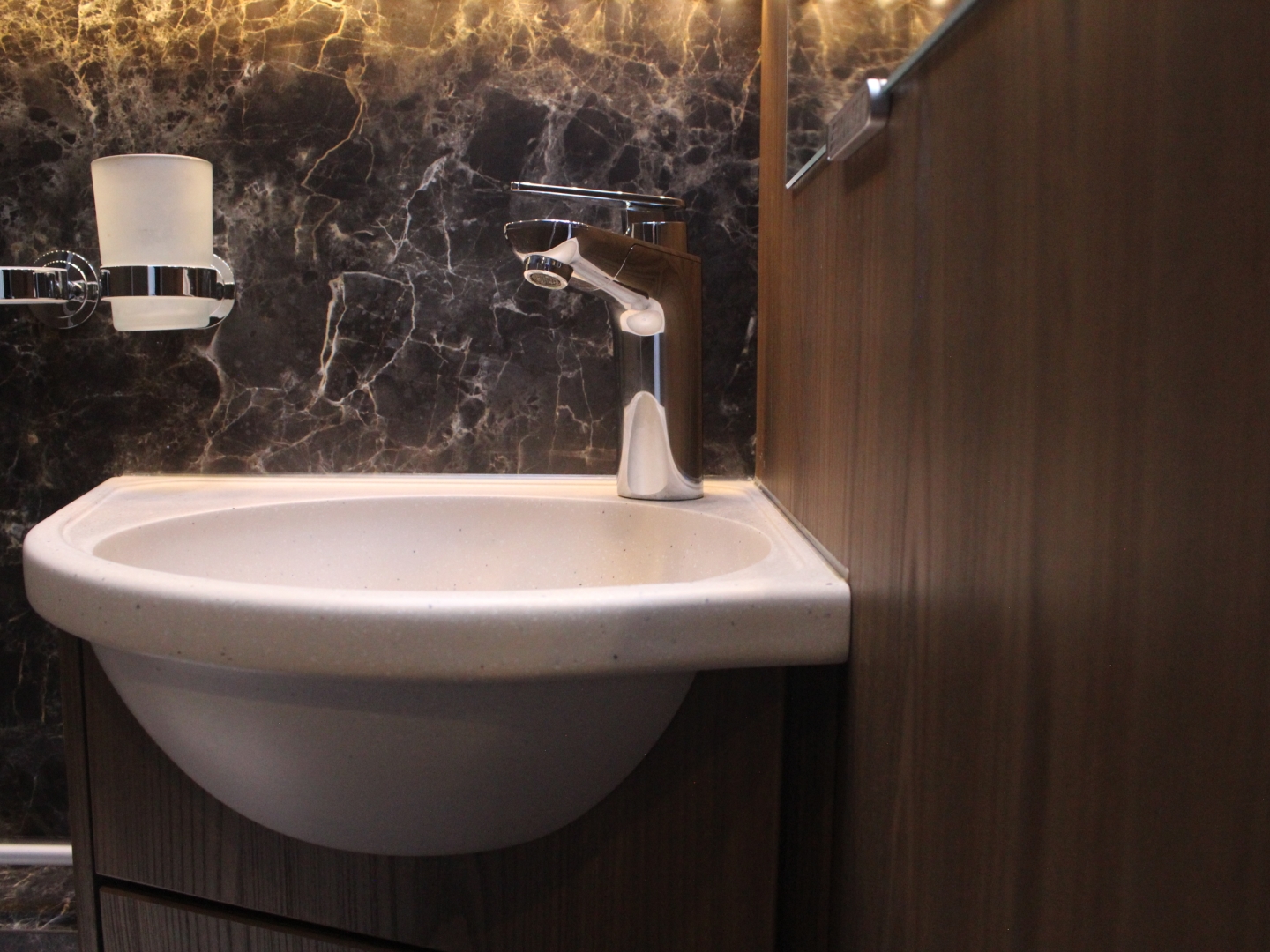 Links achterin bevind zich de ruime douchecabine, en er tegenover het toilet Thetford met SOG automatische toilet ontluchting en extra kastruimte.
