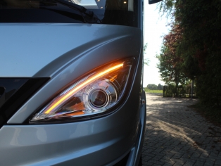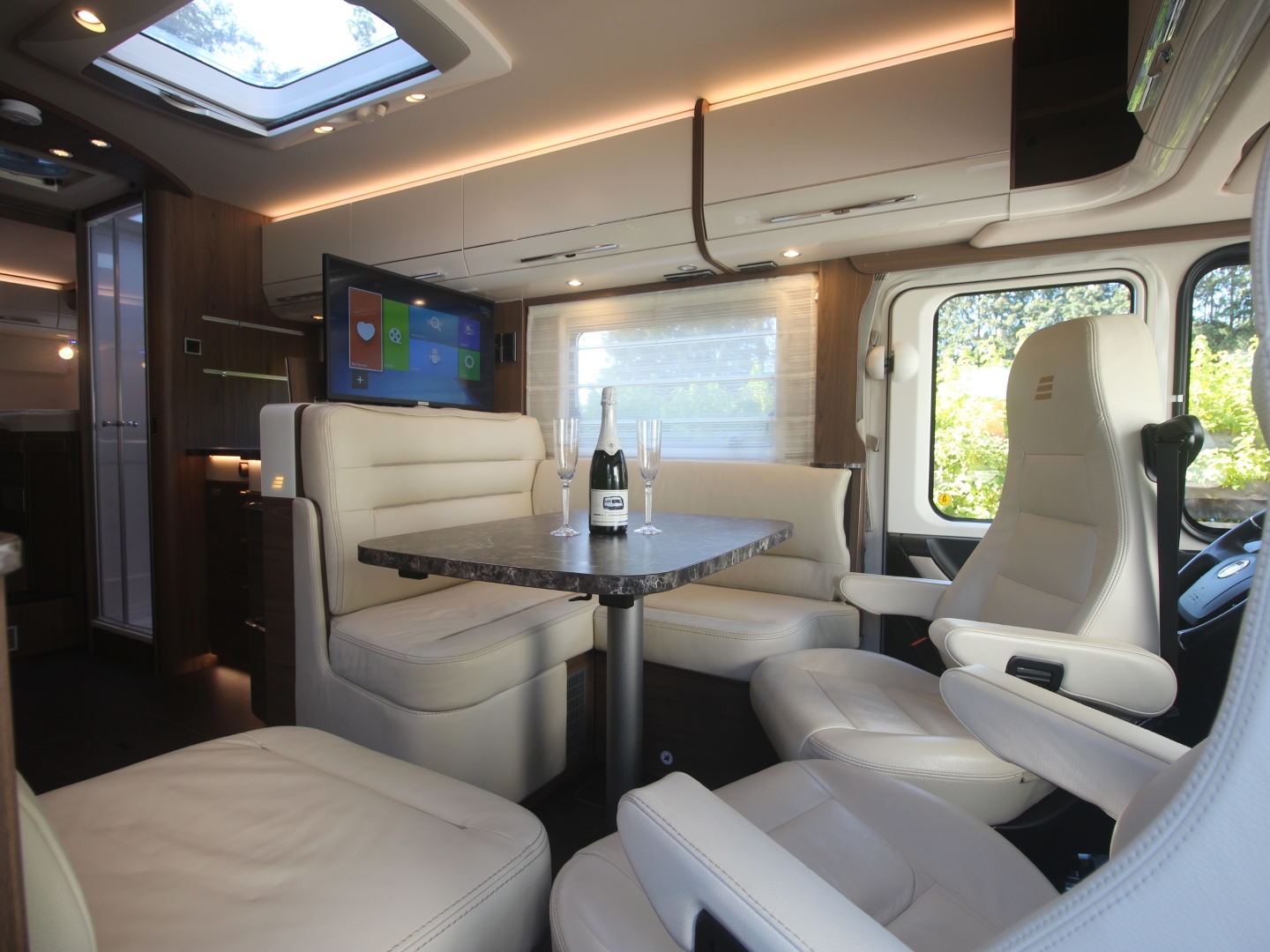 2 comfortabele, met leer beklede, Aguti Ergoflex pilotenstoelen in hoogte verstelbaar en kantelbaar, draaibaar naar een gezellige comfort L-zit met luxe salontafel. Het interieur bestaat uit het moderne meubeldesign Velvet Ash met de luxe lederen bekleding wat in combinatie met de vele (indirecte) LED verlichting een bijzondere sfeer geeft. Schitterende bovenkastjes in de cabine, in plaats van een hefbed, wat een bijzonder ruime salon creëert. Het geheel word verwarmd door het comfortabele ALDE 3020 vloeistof-verwarming. Cabineramen zijn voorzien van vouw- verduistering van hoogwaardig plisséstof. Het voorraam word verduistert dmv. een elektrisch rolluik.