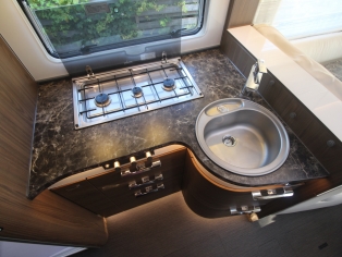 De royale keuken heeft een luxe keukenblad met spoelbak en 3 pits kooktoestel met automatische ontsteking, diverse gelagerde laden met verrassend veel bergruimte voor het kookgerei en boodschappen, grote dubbeldeurs koelkast 160 ltr met aparte vriezer, oven en automatische omschakeling van 220 V/12 V/gas