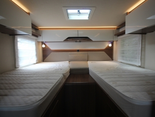 Het slaapgedeelte achterin heeft 2 enkele bedden met traagschuim matras voor optimaal slaapcomfort, dicht te leggen naar een groot bed. In de cabine een royaal 2 persoons hefbed.