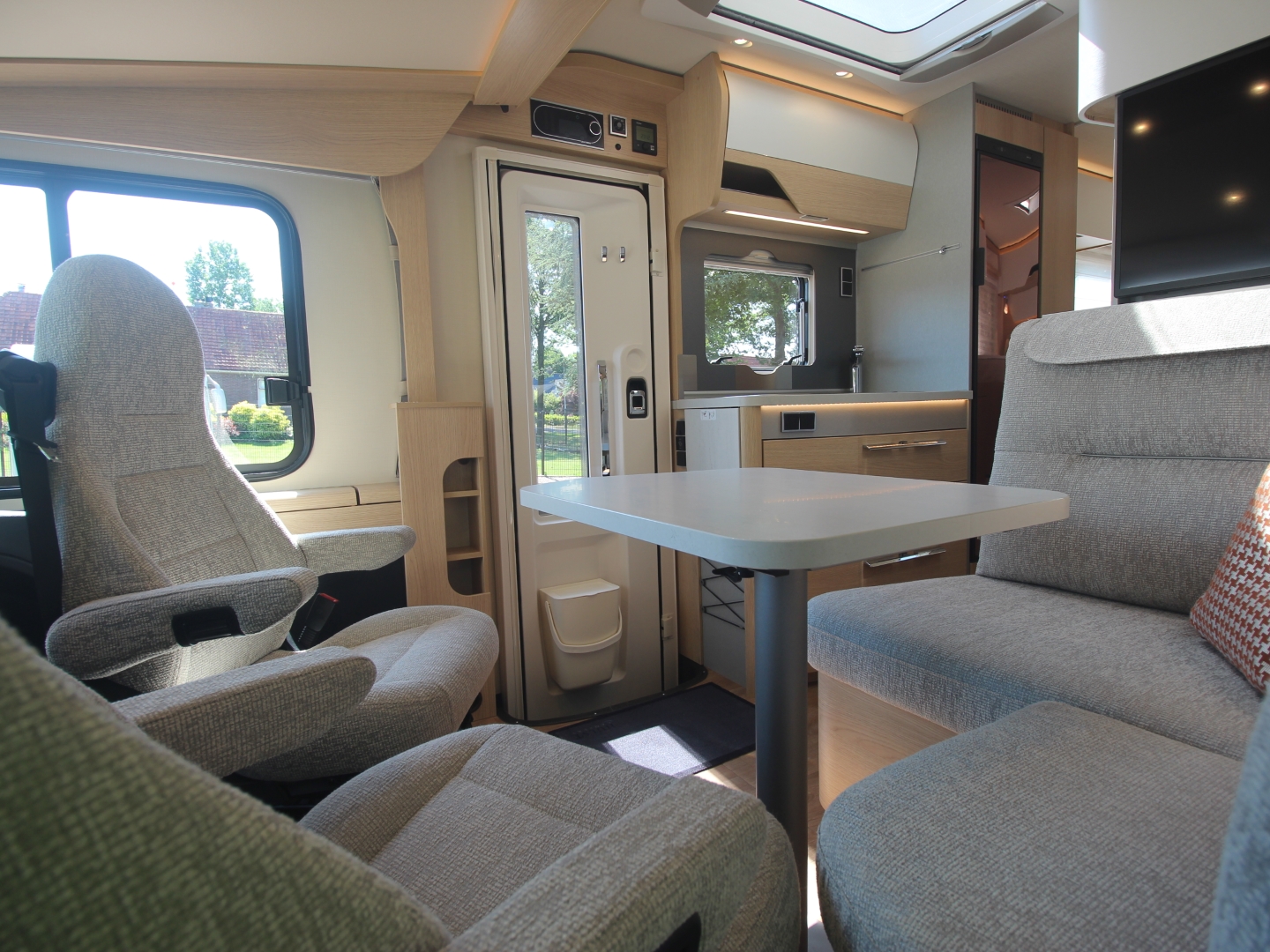 2 comfortabele pilotenstoelen in hoogte verstelbaar, draaibaar naar een gezellige zitgroep met luxe salontafel en groot panoramadak er boven.