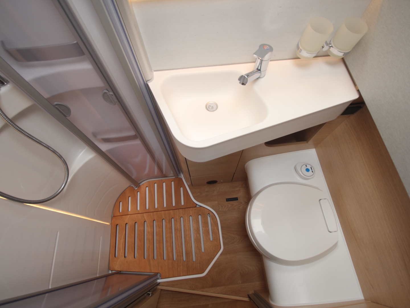 De ruime badkamer met wastafel heeft een Thetford toilet met extra kastruimte en een aparte grote douchecabine.