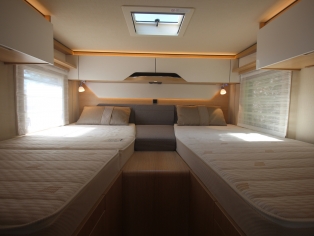 Het slaapgedeelte achterin heeft 2 enkele bedden met traagschuim matras op schotellatten bodem voor optimaal slaapcomfort, dicht te leggen naar een groot bed.