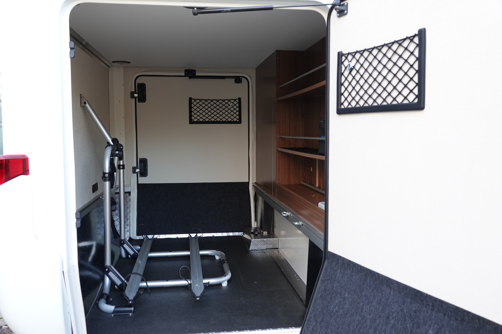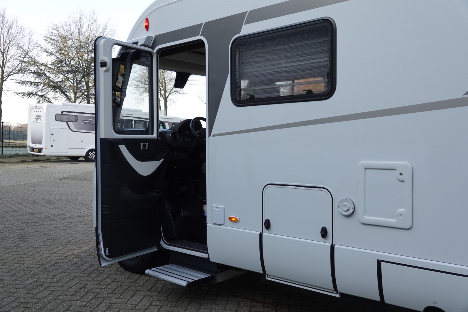 Bovendien is deze camper voorzien van fietsendrager in garage, Thule luifel 4.5 meter, Truma Duo control met crashsensor, groot zonnepaneel en elektrisch uitschuifbare opstap bestuurdersdeur.