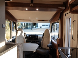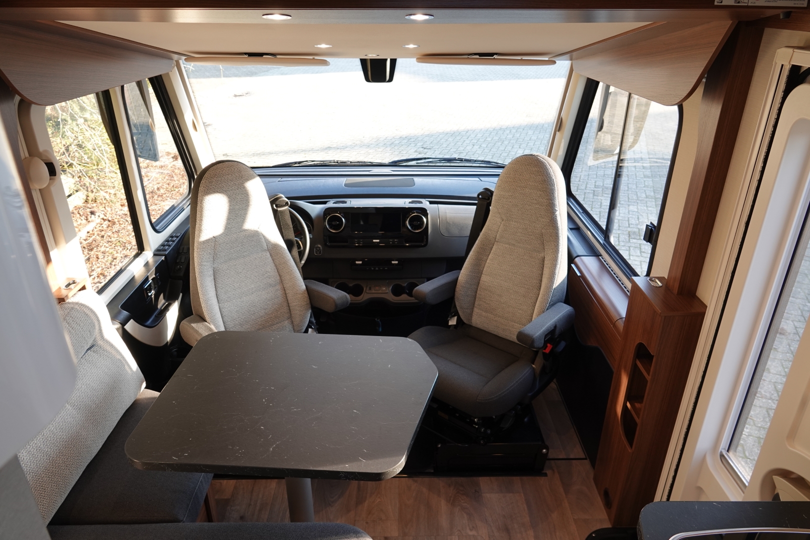 2 comfortabele pilotenstoelen in hoogte verstelbaar, draaibaar naar een gezellige zitgroep met luxe salontafel en groot panoramadak er boven.