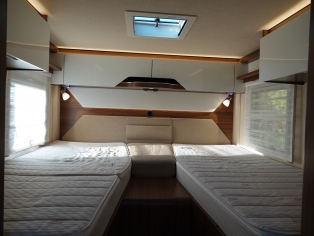 Het slaapgedeelte achterin heeft 2 enkele bedden met traagschuim matras voor optimaal slaapcomfort, dicht te leggen naar een groot bed. In de cabine een royaal 2 persoons hefbed.