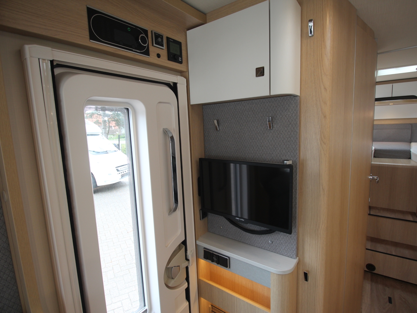 Het interieur bestaat uit het Hymer Grand Oak meubeldecor met de luxe Milos bekleding wat in combinatie met de vele LED verlichting een bijzondere sfeer geeft.