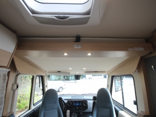2 comfortabele pilotestoelen kantelbaar en in hoogte verstelbaar, draaibaar naar een gezellige zitgroep met luxe salontafel en groot panoramadak er boven.