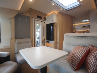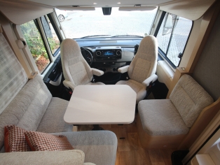 2 comfortabele pilotestoelen kantelbaar en in hoogte verstelbaar, draaibaar naar een gezellige zitgroep met luxe salontafel en groot panoramadak er boven.