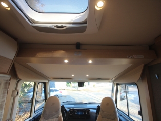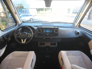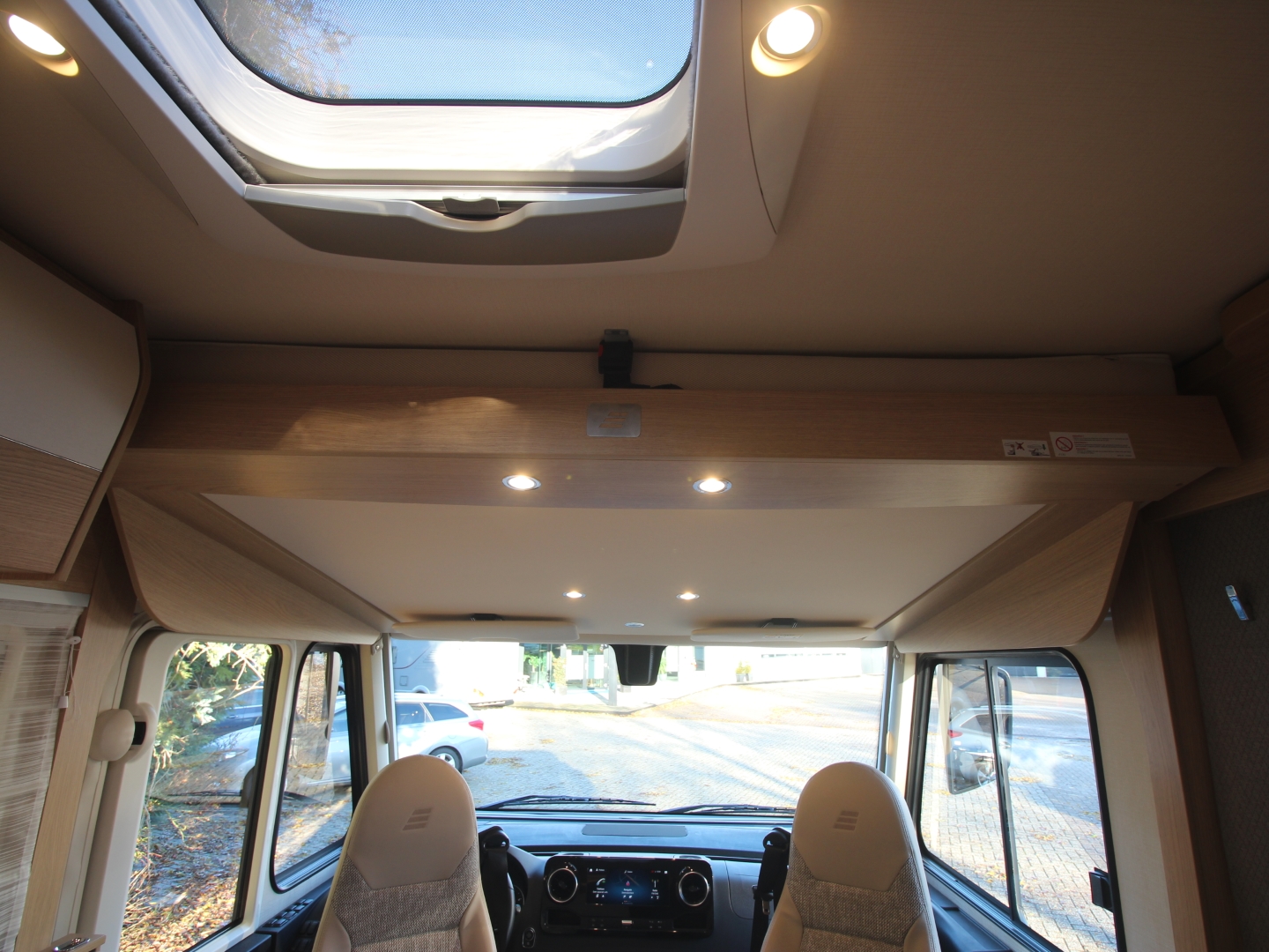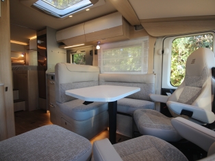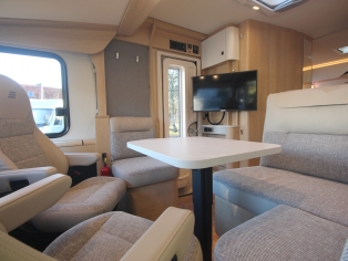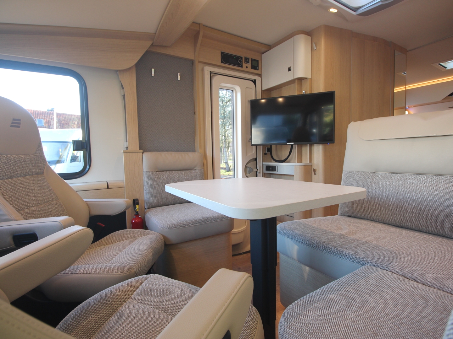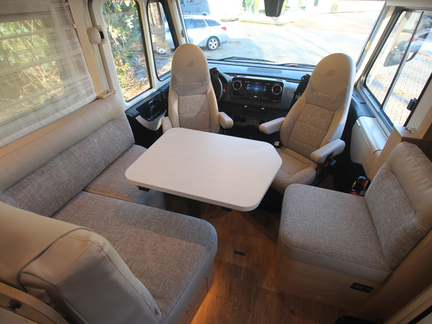 2 comfortabele pilotestoelen kantelbaar en in hoogte verstelbaar, draaibaar naar een gezellige zitgroep met luxe salontafel en groot panoramadak er boven.