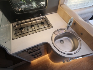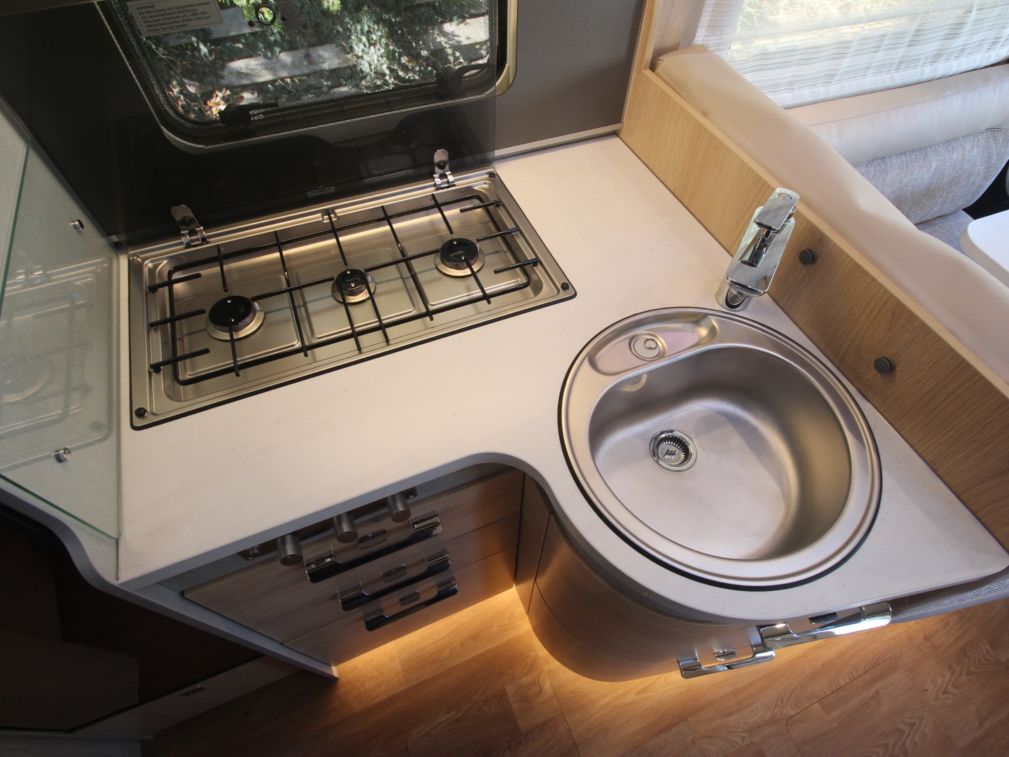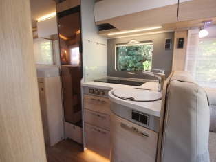 De royale hoekkeuken heeft een luxe keukenblad met spoelbak en 3 pits kooktoestel met automatische ontsteking, diverse gelagerde laden met verrassend veel bergruimte voor het kookgerei en boodschappen, grote Smart Tower koelkast met vriezer, en automatische energiekeuze.