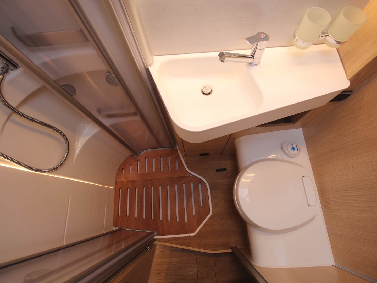 De ruime badkamer met wastafel heeft een Thetford toilet met SOG, extra kastruimte, en een grote douchecabine.