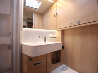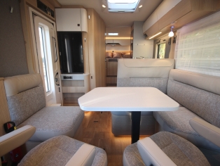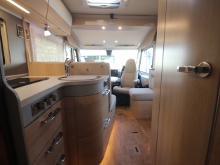 Het interieur bestaat uit het Hymer Grand Oak meubeldecor met de luxe leer/stof bekleding Creola wat in combinatie met de vele LED verlichting een bijzondere sfeer geeft.