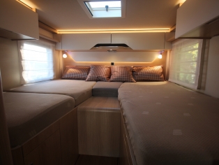 Het slaapgedeelte achterin heeft 2 enkele bedden met traagschuim matras voor optimaal slaapcomfort. Van de zitgroep is een extra slaapplaats te maken.