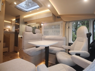 2 comfortabele pilotestoelen kantelbaar en in hoogte verstelbaar, draaibaar naar een gezellige zitgroep met luxe salontafel en groot panoramadak er boven.