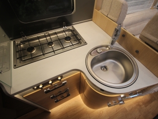 De royale hoekkeuken heeft een luxe keukenblad met spoelbak en 3 pits kooktoestel met automatische ontsteking, diverse gelagerde laden met verrassend veel bergruimte voor het kookgerei en boodschappen, grote Smart Tower koelkast met vriezer, en automatische energiekeuze.