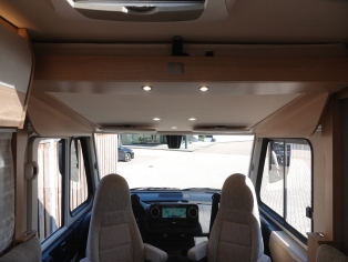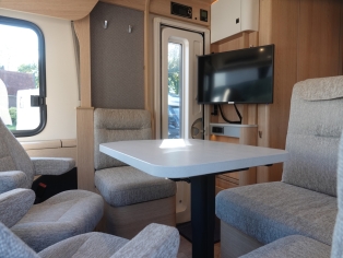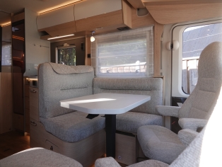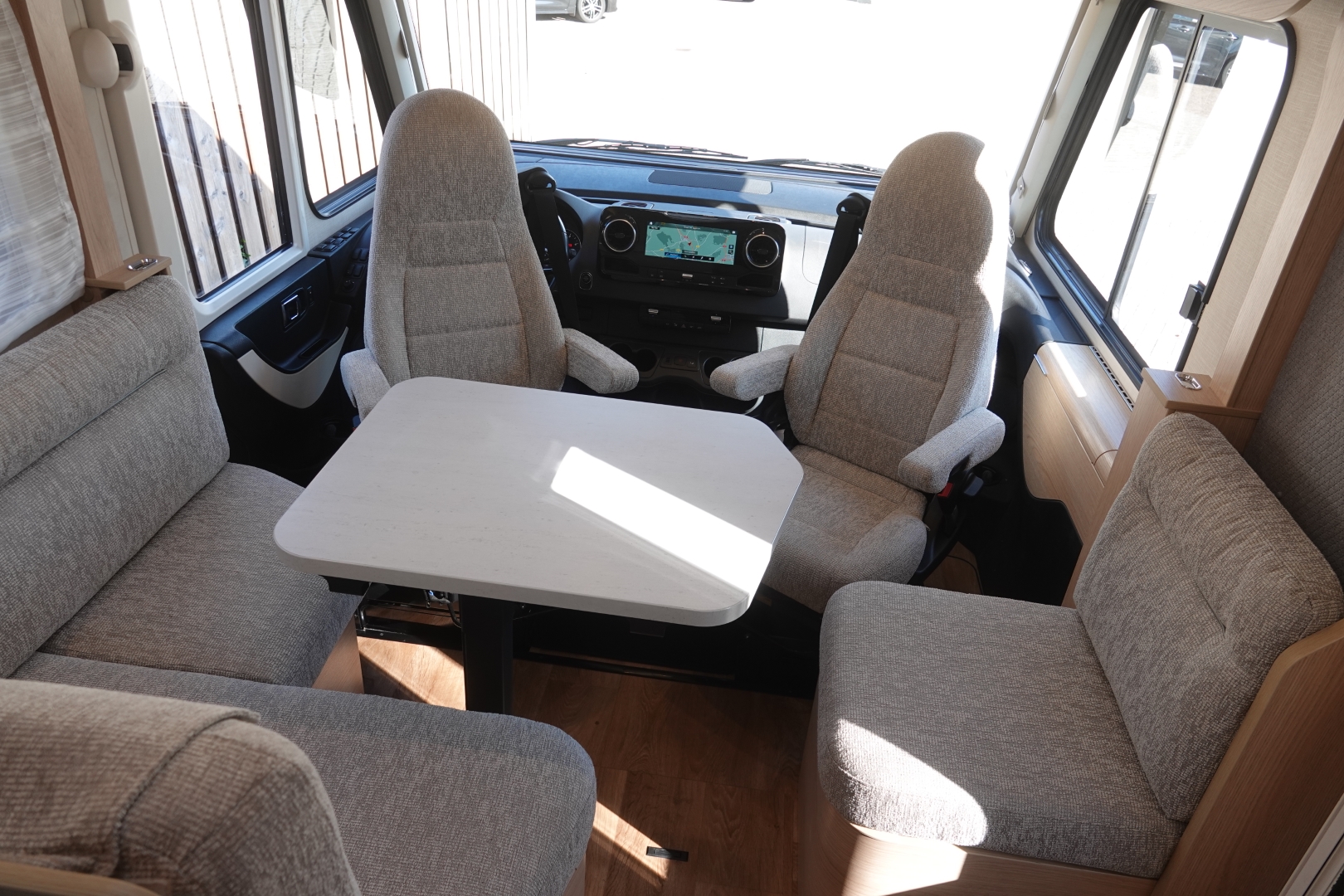 2 comfortabele pilotestoelen kantelbaar en in hoogte verstelbaar, draaibaar naar een gezellige zitgroep met luxe salontafel en groot panoramadak er boven.
