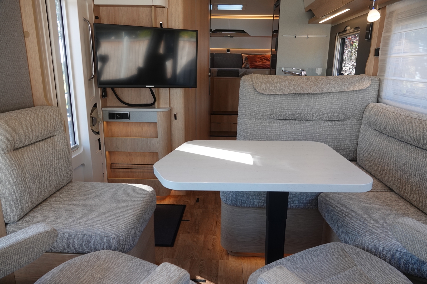 Bovendien is deze camper voorzien van fietsendrager in garage, grote Thule luifel, extra stopcontacten pakket en automatische schotel Oyster 85 Vision met 32 inch smart TV.