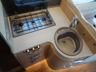 De royale hoekkeuken heeft een luxe keukenblad met spoelbak en 3 pits kooktoestel met automatische ontsteking, diverse gelagerde laden met verrassend veel bergruimte voor het kookgerei en boodschappen, grote Smart Tower koelkast met vriezer, en automatische energiekeuze.