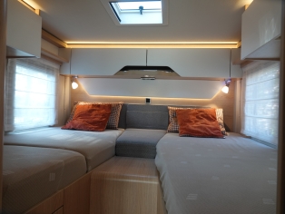 Het slaapgedeelte achterin heeft 2 enkele bedden (dicht te leggen tot 1 groot bed) met traagschuim matras voor optimaal slaapcomfort. Het hefbed bied een royale 2 persoons slaapplaats, en van de zitgroep is ook een extra bed te maken.