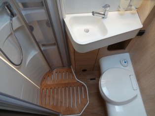 De ruime badkamer met wastafel heeft een Thetford toilet met extra kastruimte, en een grote douchecabine.