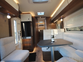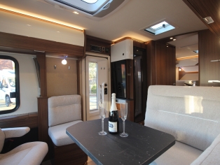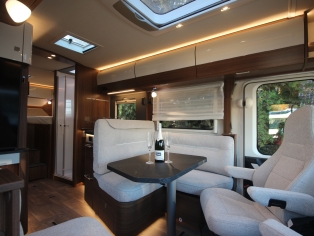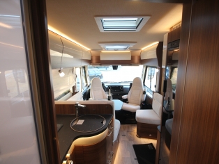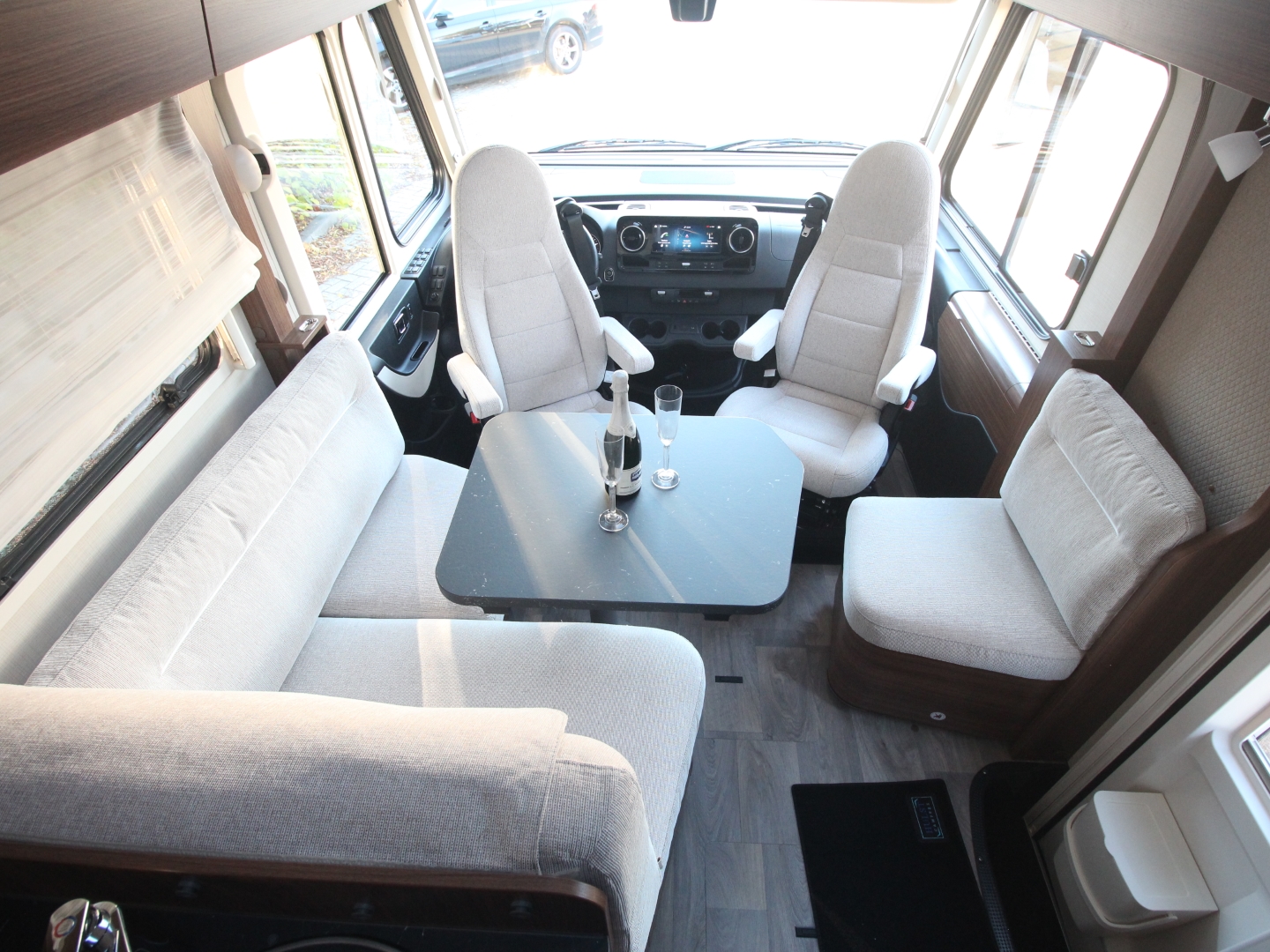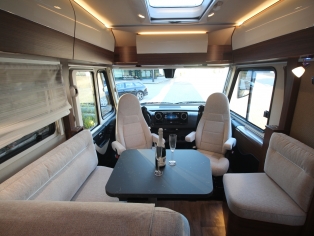 2 comfortabele pilotestoelen kantelbaar en in hoogte verstelbaar, draaibaar naar een gezellige zitgroep met luxe salontafel en groot panoramadak er boven.