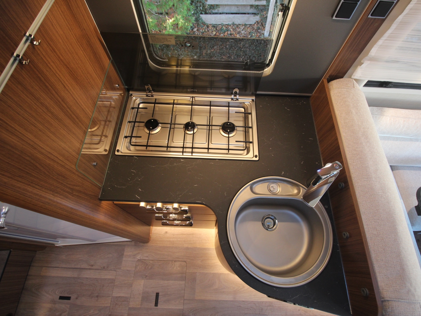 De royale hoekkeuken heeft een luxe keukenblad met spoelbak en 3 pits kooktoestel met automatische ontsteking, diverse gelagerde laden met verrassend veel bergruimte voor het kookgerei en boodschappen, grote Smart Tower koelkast met vriezer, en automatische energiekeuze.