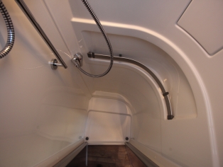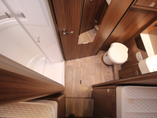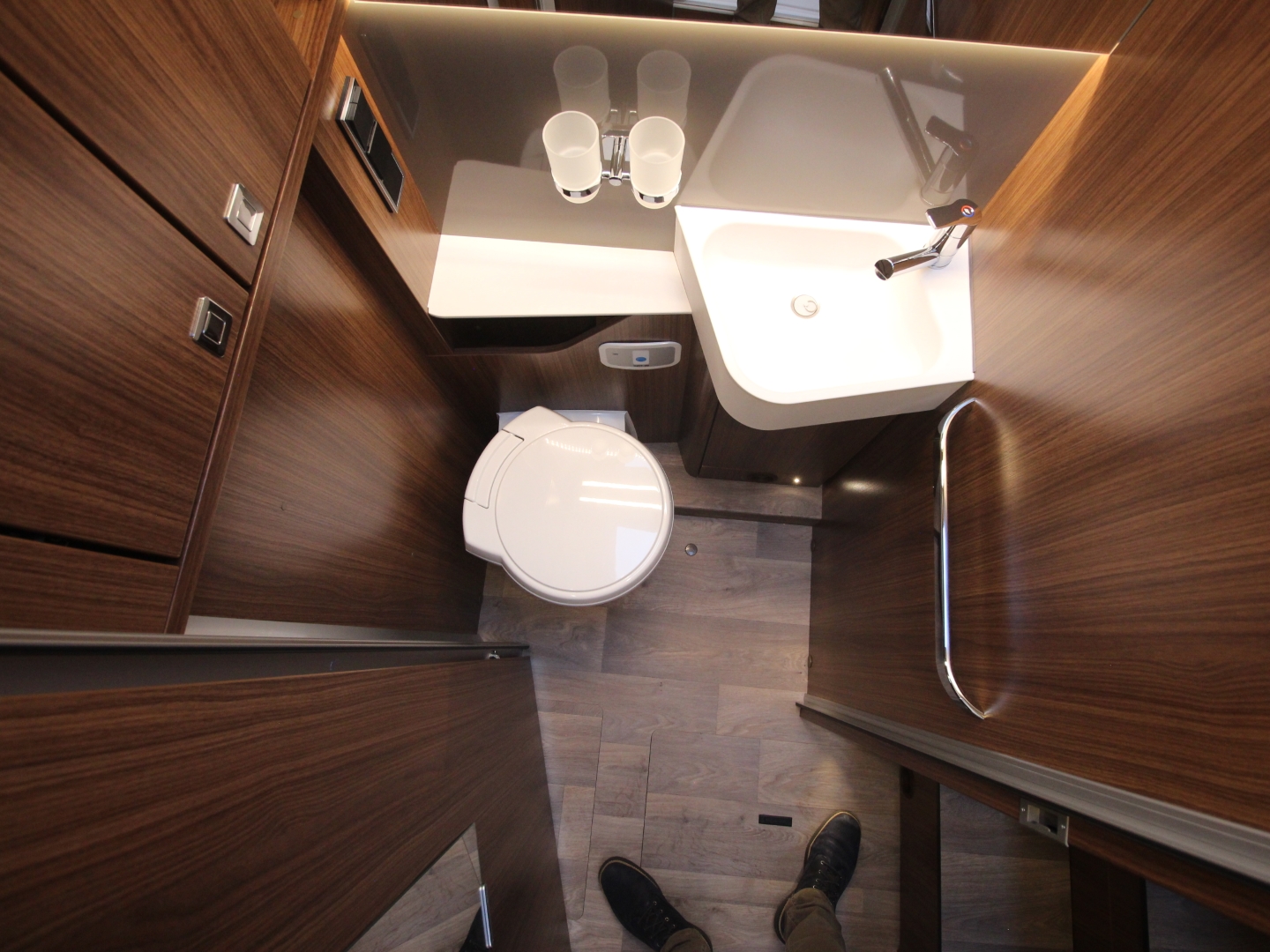 De ruime badkamer met wastafel heeft een Thetford toilet met SOG en extra kastruimte, en ertegenover een grote douchecabine.