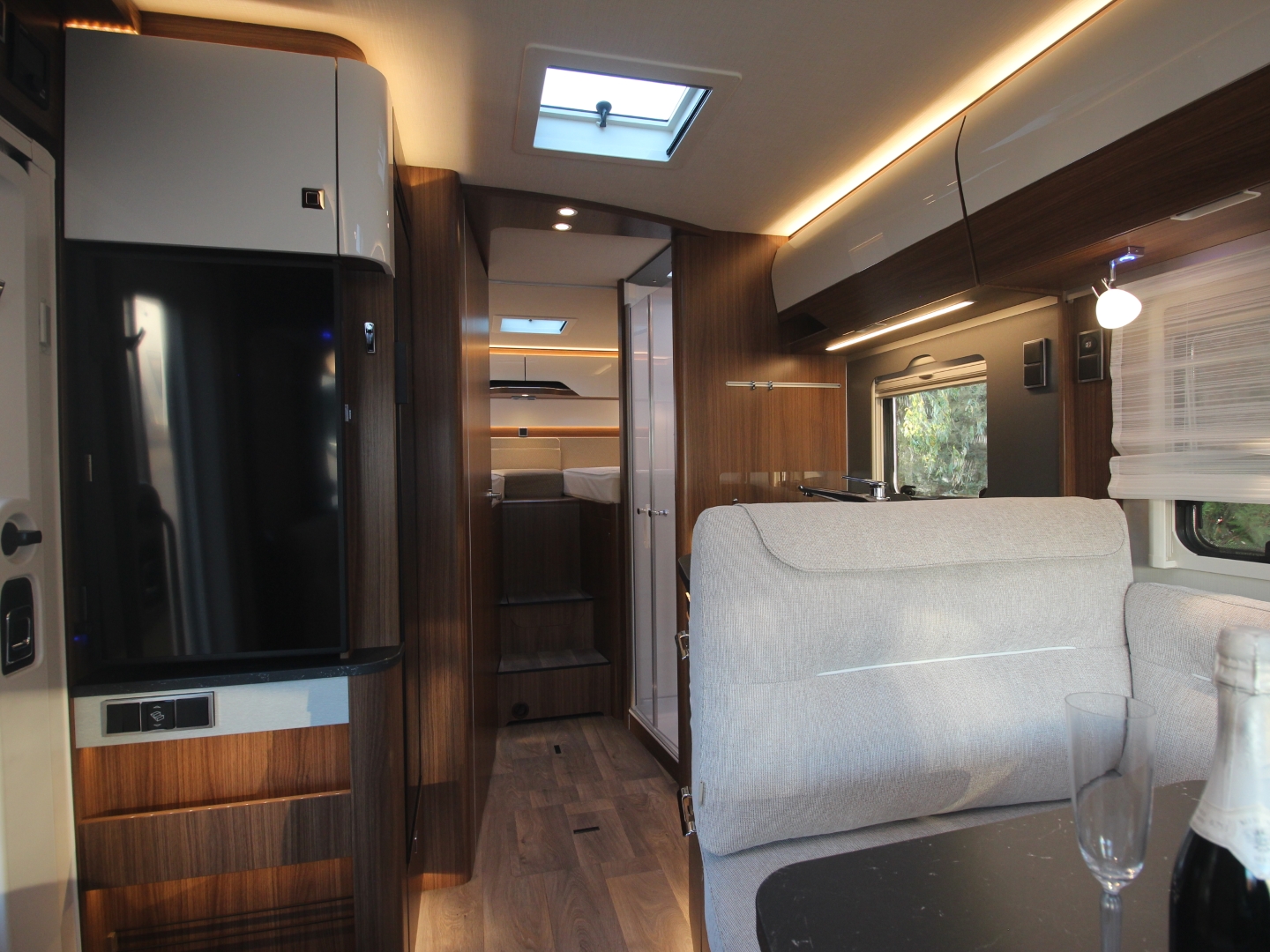 Het interieur bestaat uit het Hymer Noce Cognac meubilair met de luxe Cusco stof bekleding wat in combinatie met de vele LED verlichting een bijzondere sfeer geeft. In de cabine zijn bergkasten gemonteerd ipv. een hefbed. Hierdoor ontstaat er een bijzonder ruime salon.