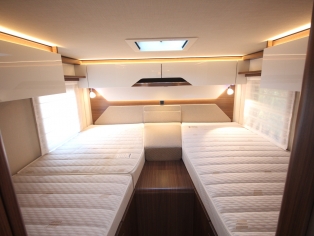 Het slaapgedeelte achterin heeft 2 enkele bedden (dicht te leggen tot 1 groot bed) met traagschuim matras op schotelsysteem voor optimaal slaapcomfort.