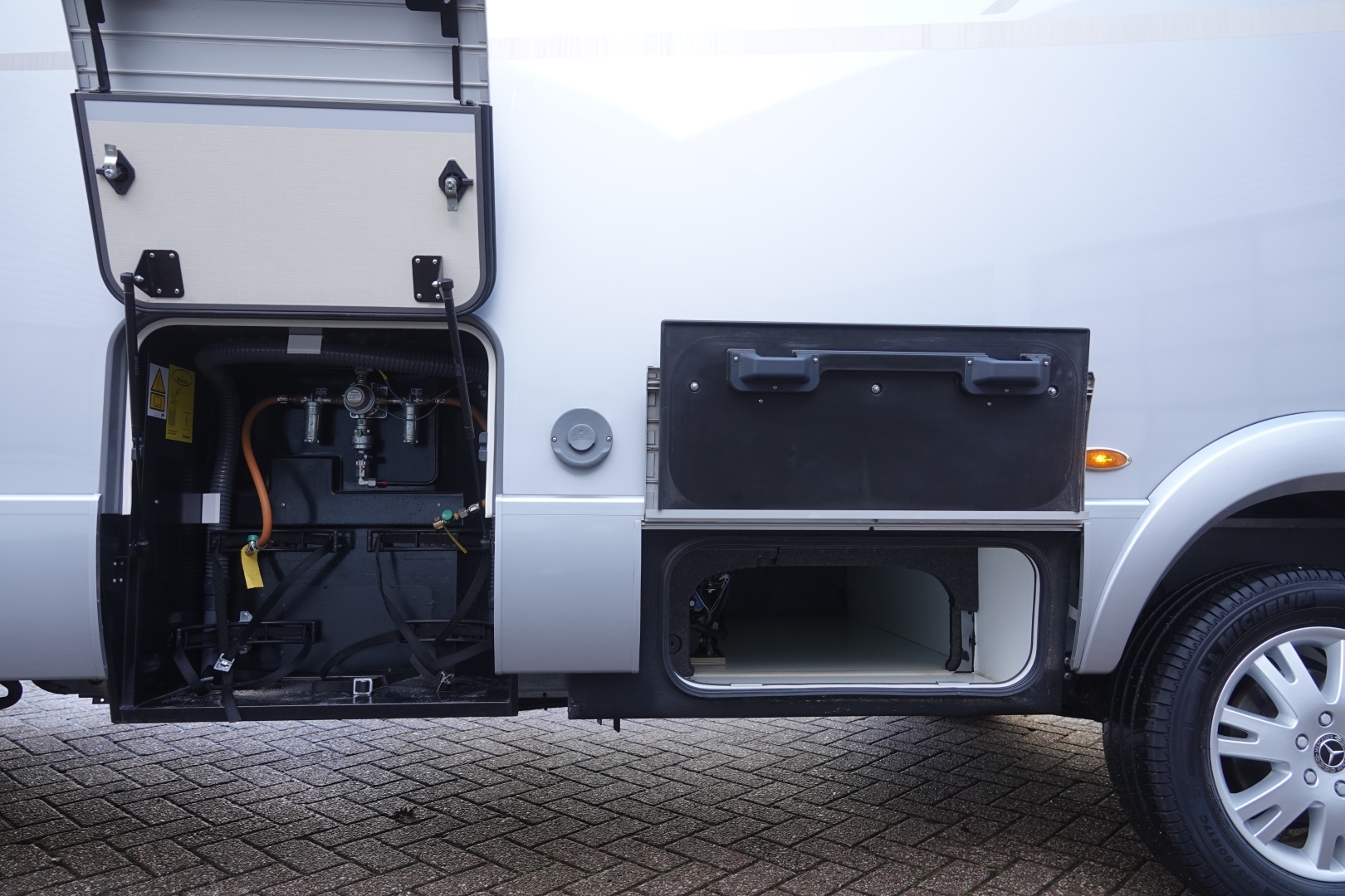 De camper is voorzien van het Truma Combi boiler/verwarming systeem met ring-verwarming. De 180 ltr schoon - en 150 ltr vuilwatertank zijn in de (verwarmde) vloer weggewerkt.