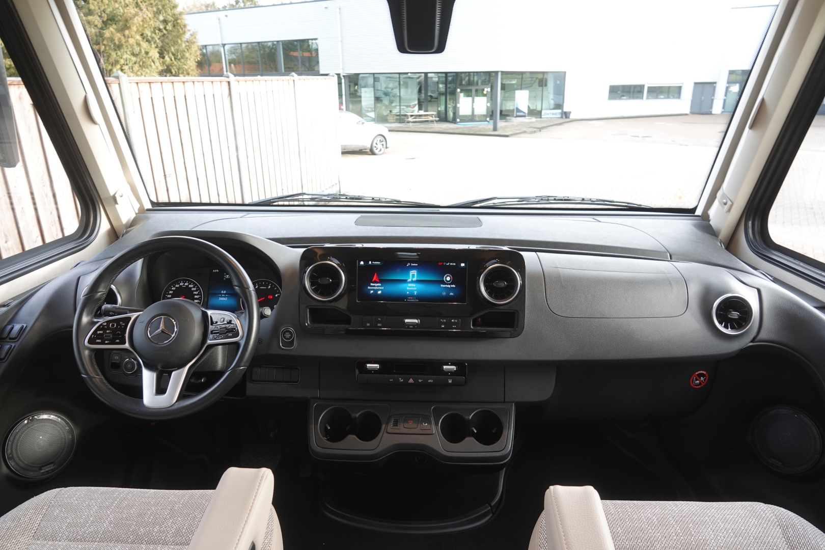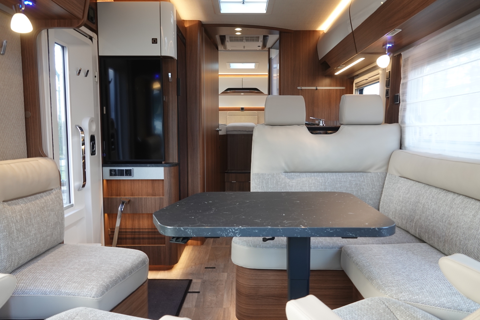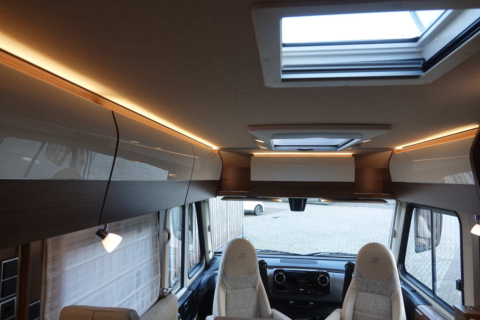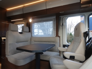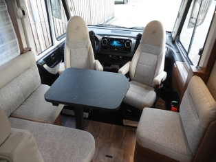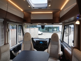 2 comfortabele pilotestoelen kantelbaar en in hoogte verstelbaar, draaibaar naar een gezellige zitgroep met luxe salontafel en groot panoramadak er boven.