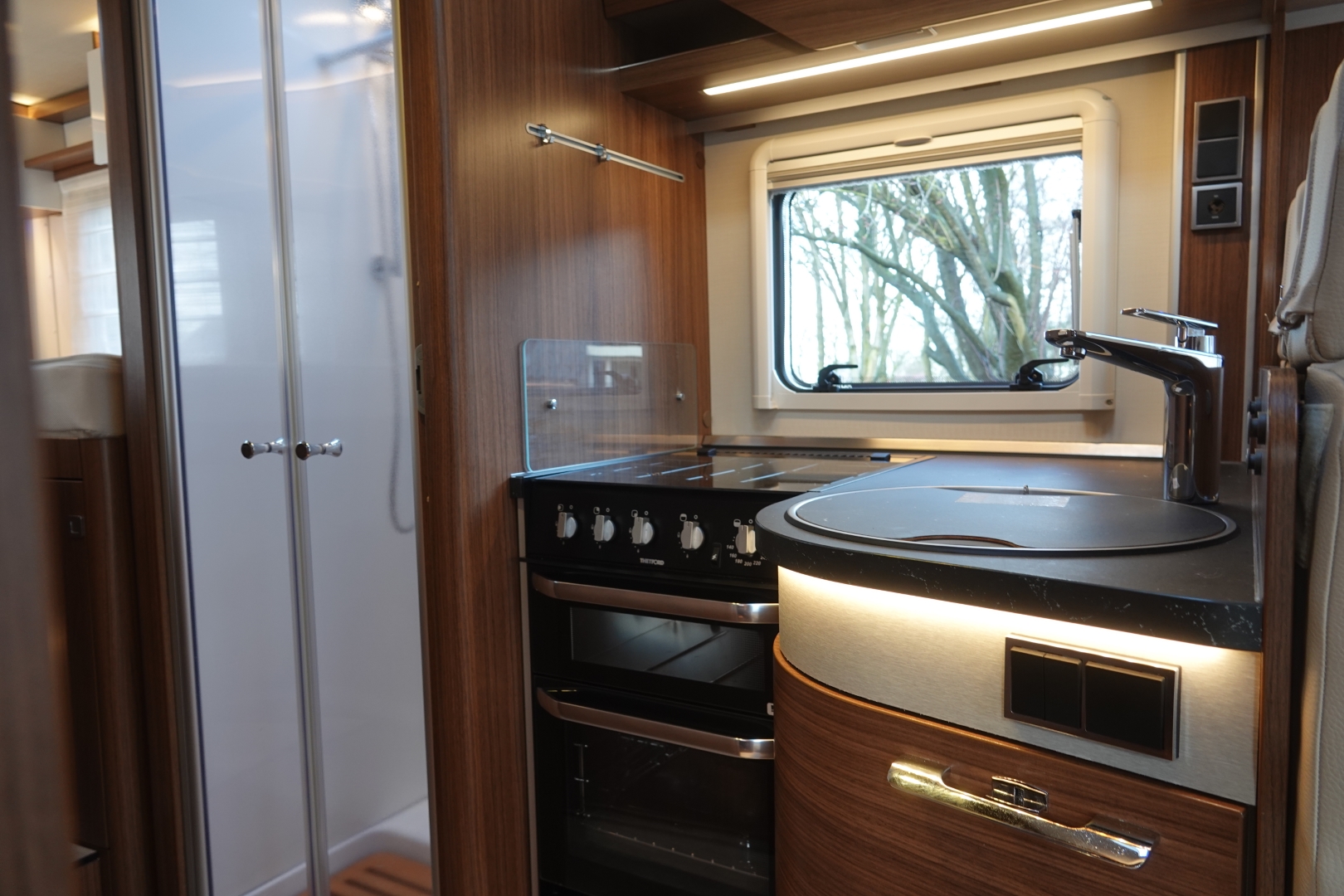 De royale hoekkeuken heeft een luxe keukenblad met spoelbak en fornuis-oven combinatie, diverse gelagerde laden met verrassend veel bergruimte voor het kookgerei en boodschappen, grote Smart Tower koelkast met vriezer, en automatische energiekeuze.