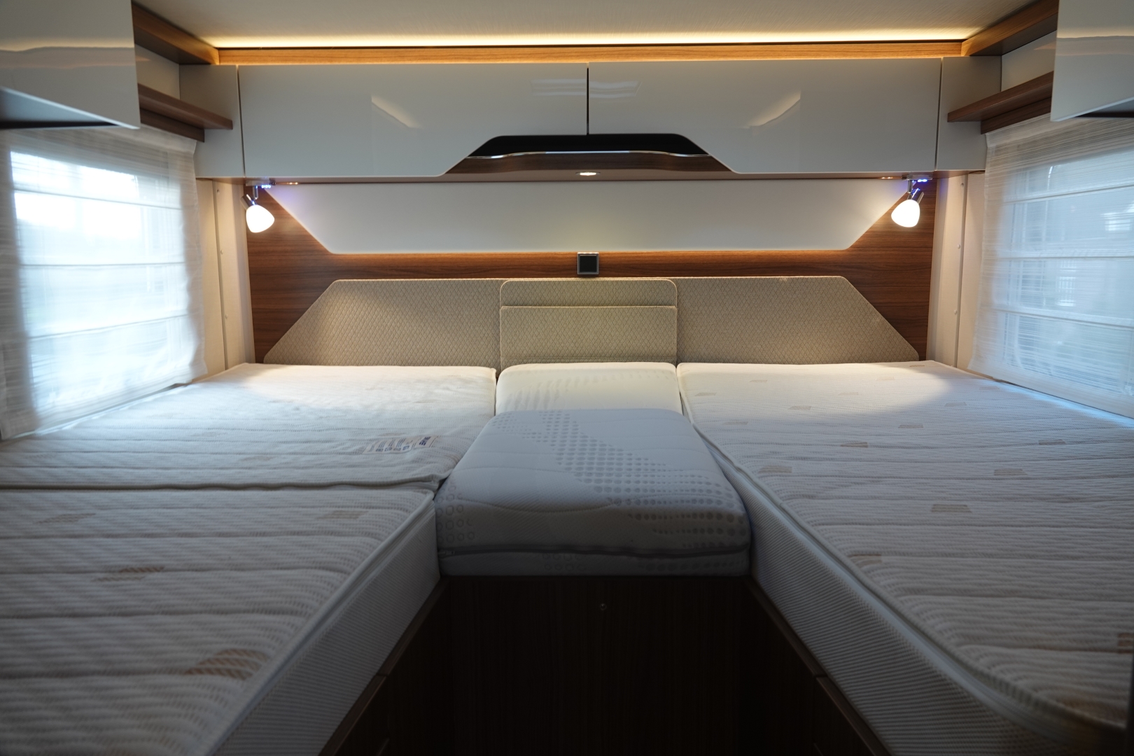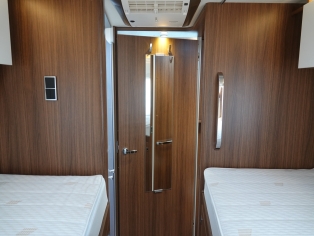 Het slaapgedeelte achterin heeft 2 enkele bedden met traagschuim matras op schotelsysteem voor optimaal slaapcomfort.