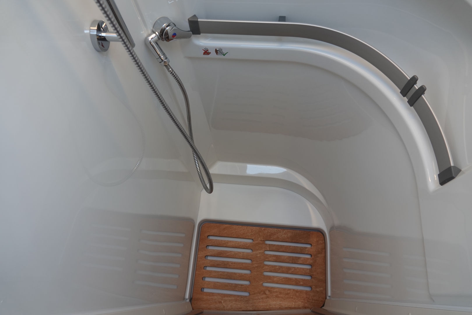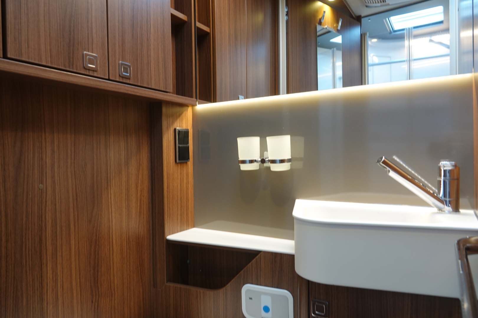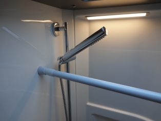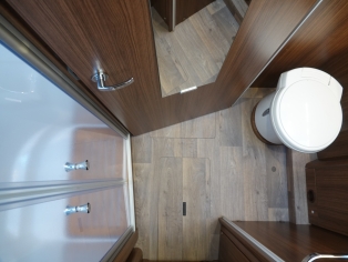 De ruime badkamer met wastafel heeft een Thetford toilet met SOG en extra kastruimte, en er tegenover een grote douchecabine. Door de tussendeur te sluiten ontstaat er ruime slaapkamer met sanitaire ruimte.