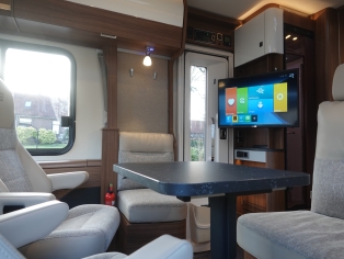 Bovendien is deze camper voorzien van een automatische schotel Oyster Vision met 32 inch Alphatronics Smart TV, grote Thule luifel, omvormer 12/220V 2000 Watt en E&P hydraulisch levelsysteem voor het automatisch waterpas stellen.