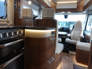Het interieur bestaat uit het Hymer Noce Cognac meubilair met de luxe Creola stof bekleding met lederinleg wat in combinatie met de vele LED verlichting een bijzondere sfeer geeft. In de cabine zijn bergkasten gemonteerd ipv. een hefbed. Hierdoor ontstaat er een bijzonder ruime salon waar je overal rechtop kunt staan. Het interieur is heerlijk koel te houden met de Truma Aventa dak-airco.