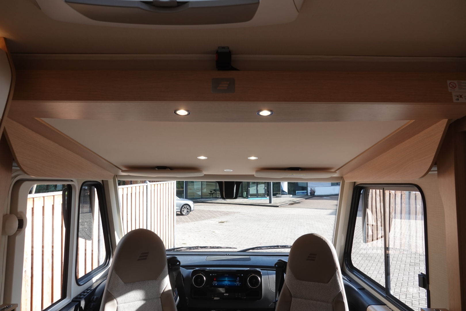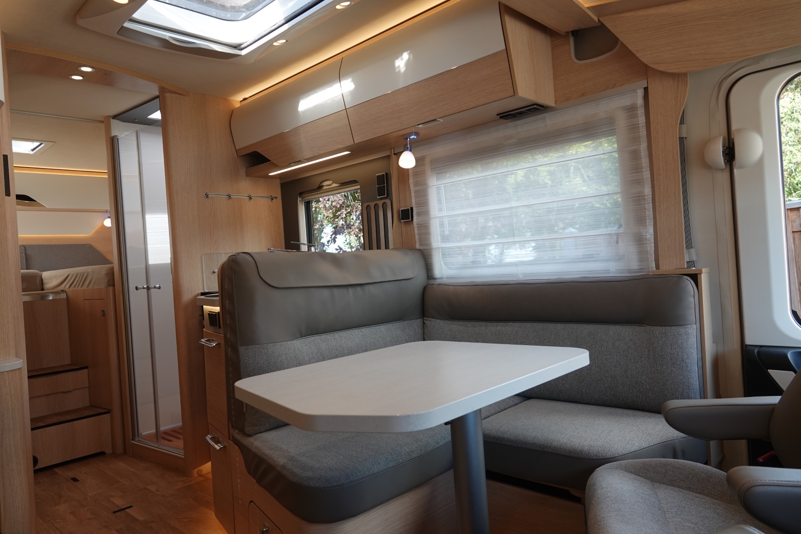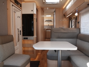 2 comfortabele pilotenstoelen in hoogte verstelbaar en kantelbaar, draaibaar naar een gezellige comfort L-zit met zijbank. Het interieur bestaat uit het moderne meubeldesign Grand Oak met luxe Dalana stofbekleding met lederinleg wat in combinatie met de vele (indirecte) LED verlichting een bijzondere sfeer geeft. Cabineramen zijn voorzien van vouw- verduistering van hoogwaardig plisséstof.
