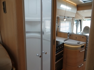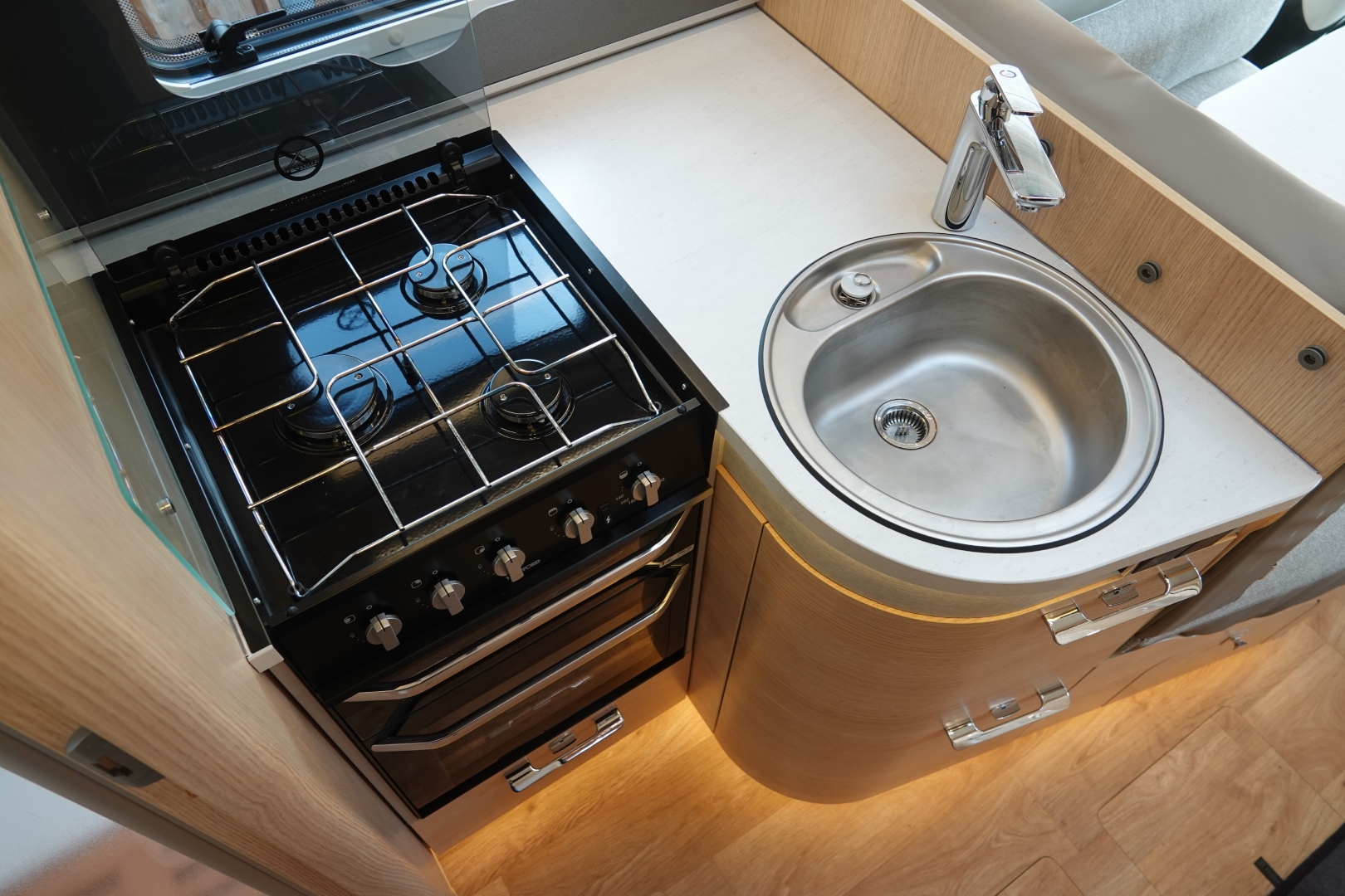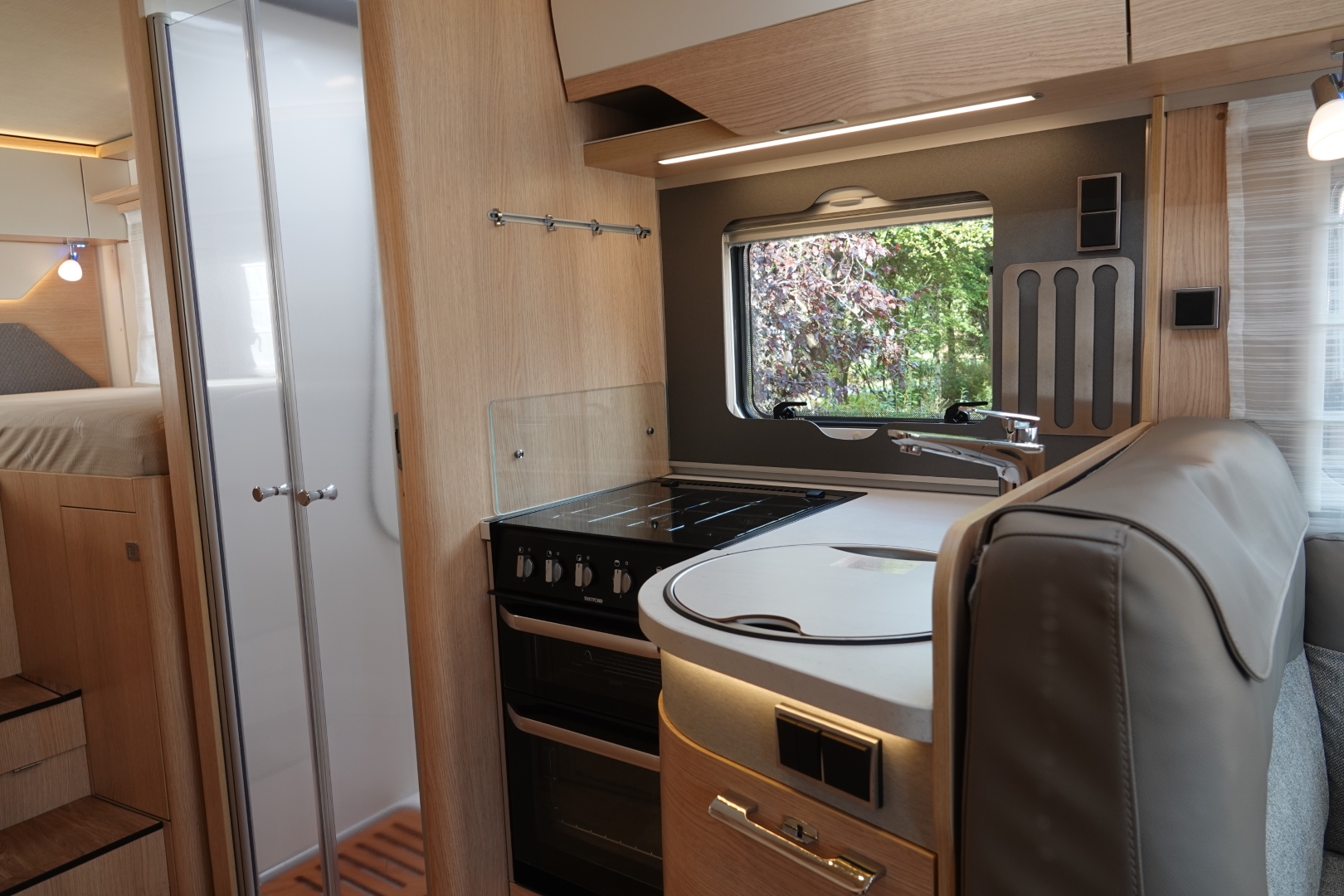 De royale hoekkeuken heeft een luxe keukenblad met spoelbak en Thetford 3 pits kooktoestel met grill en oven, diverse gelagerde laden met verrassend veel bergruimte voor het kookgerei en boodschappen, grote Smart Tower koelkast met vriezer, en automatische energiekeuze.