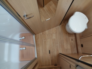 De ruime badkamer met wastafel heeft een Thetford toilet met SOG en extra kastruimte, en ertegenover een grote douchecabine.