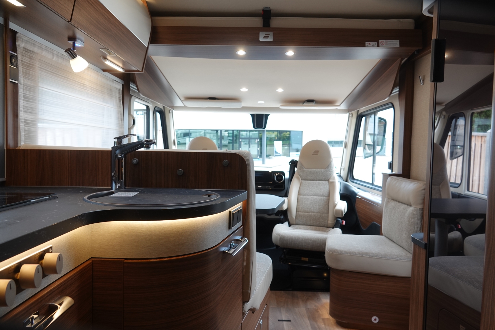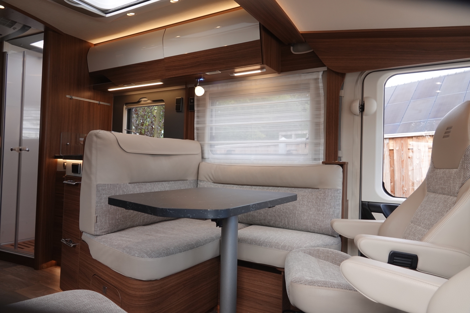 2 comfortabele pilotenstoelen in hoogte verstelbaar en kantelbaar, draaibaar naar een gezellige comfort L-zit met zijbank. Het interieur bestaat uit het moderne meubeldesign Noce Cognac met luxe Dalana stofbekleding met lederinleg wat in combinatie met de vele (indirecte) LED verlichting een bijzondere sfeer geeft. Cabineramen zijn voorzien van vouw- verduistering van hoogwaardig plisséstof.