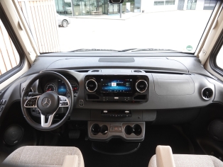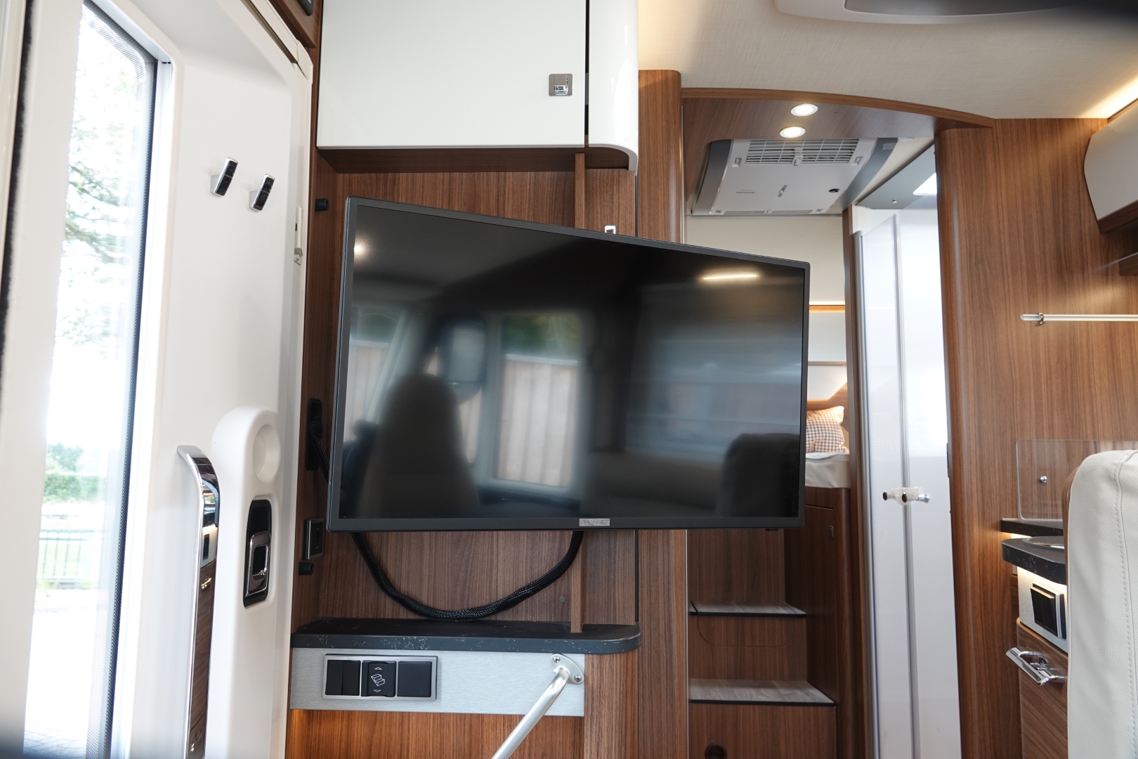 Verder is deze camper voorzien van het Mercedes chassis comfort pakket, automatische schotel Oyster Vision met 32 inch TV, grote Thule luifel, LPG installatie met buitenvuller, BBQ aansluiting, buitendouche in garage, en hydraulisch levelsysteem voor het automatisch waterpas stellen.