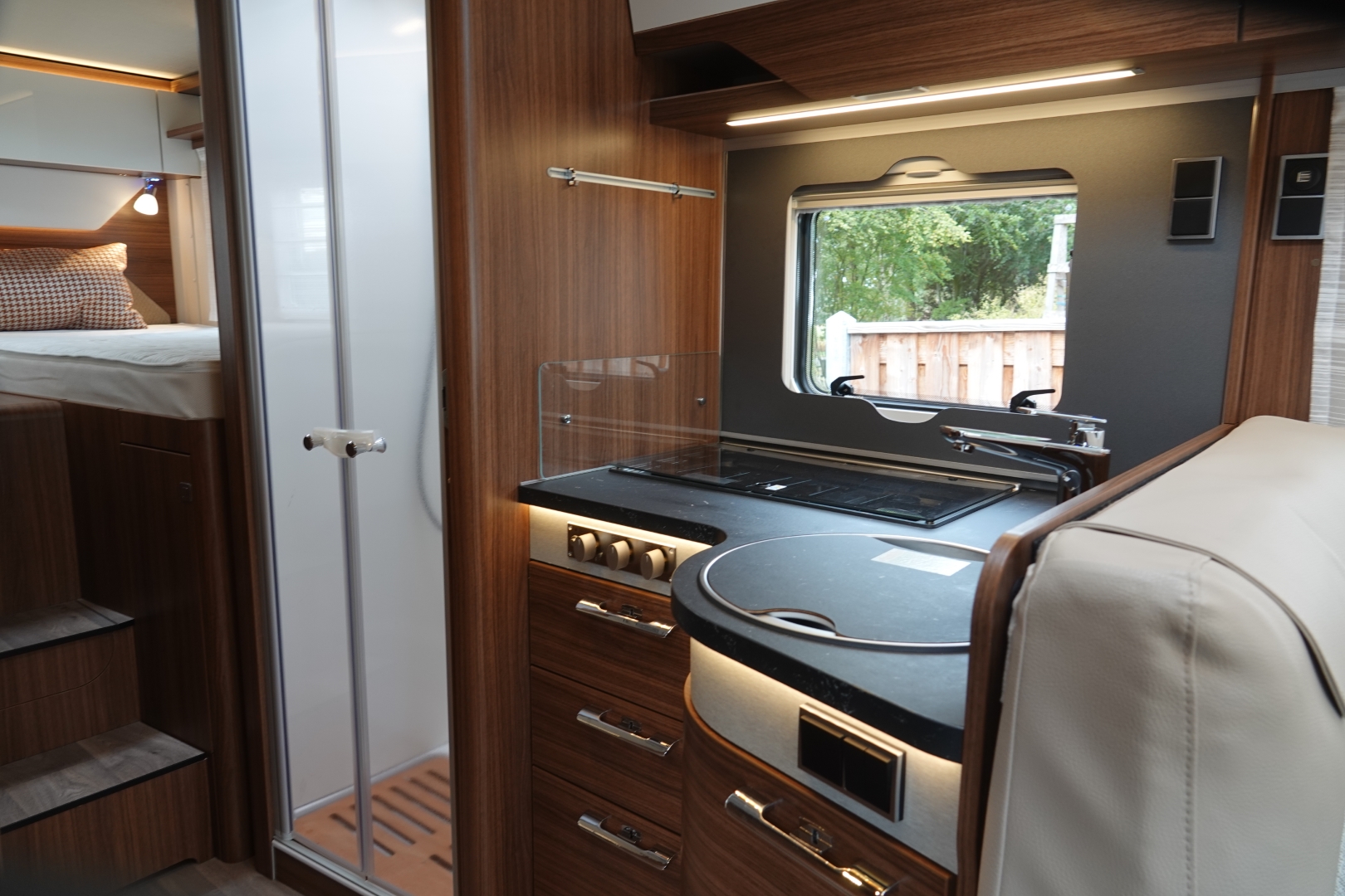 De royale hoekkeuken heeft een luxe keukenblad met spoelbak en Thetford 3 pits kooktoestel, diverse gelagerde laden met verrassend veel bergruimte voor het kookgerei en boodschappen, grote Smart Tower koelkast met vriezer, en automatische energiekeuze.
