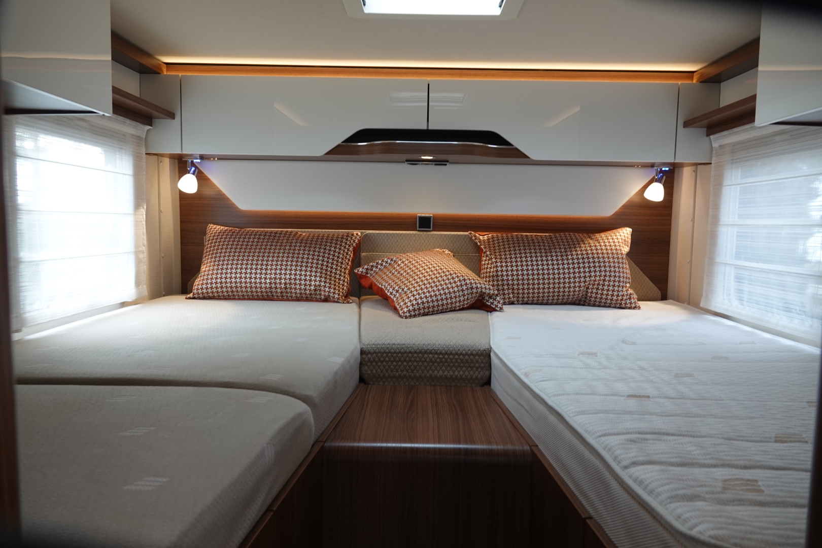 Het slaapgedeelte achterin heeft 2 enkele bedden ( dicht te leggen tot eén groot bed )met traagschuim matras wat garant staat voor optimaal slaapcomfort. Bovenin de cabine bevind zich een royaal 2 persoons hefbed. De Truma Aventa dakairco zorgt voor koele nachten.