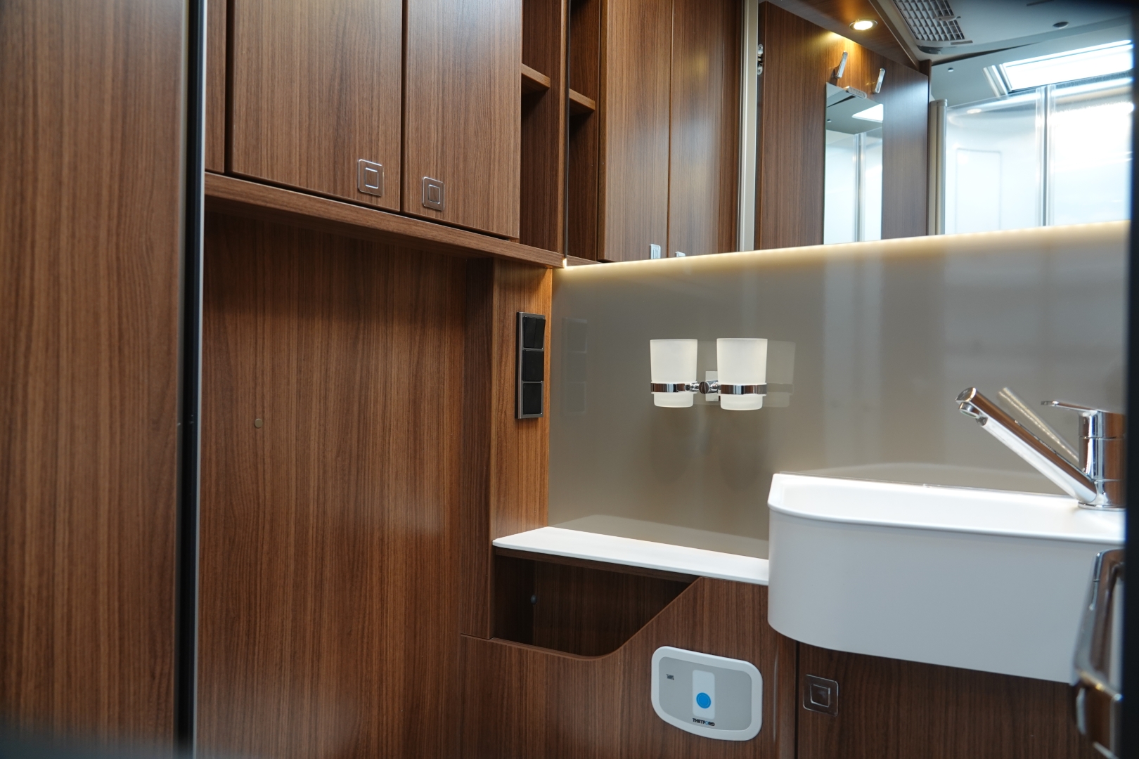 De ruime badkamer met wastafel heeft een Thetford toilet met SOG en extra kastruimte, en ertegenover een grote douchecabine.