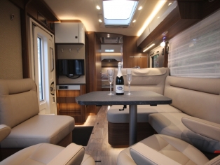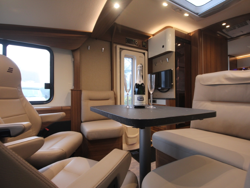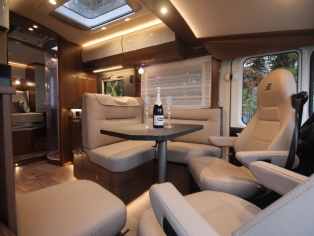 2 comfortabele met leer beklede pilotestoelen kantelbaar en in hoogte verstelbaar, draaibaar naar een gezellige zitgroep met luxe salontafel en groot panoramadak er boven.