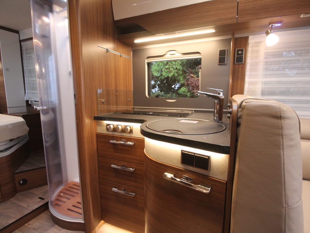 De ruime badkamer met wastafel heeft een Thetford toilet met extra kastruimte, en ertegenover een grote douchecabine. Door de tussenwand te sluiten ontstaat er een ruime slaapkamer met sanitaire ruimte en veel privacy.
