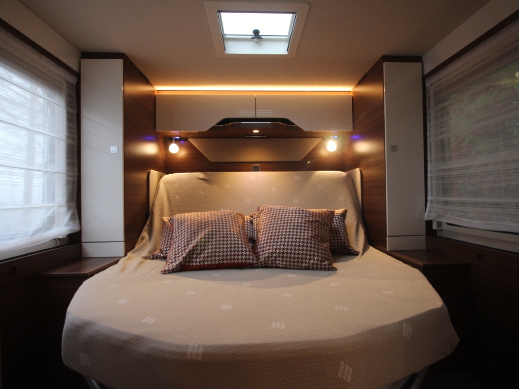 Het slaapgedeelte achterin heeft een royaal vrijstaand bed van 195x150 cm (in hoogte verstelbaar) met meerzone koudschuim matras op lattenbodem voor optimaal slaapcomfort. Bovenin de cabine is een ruim tweepersoons bed waarvan eenvoudig twee enkele bedden te maken zijn.