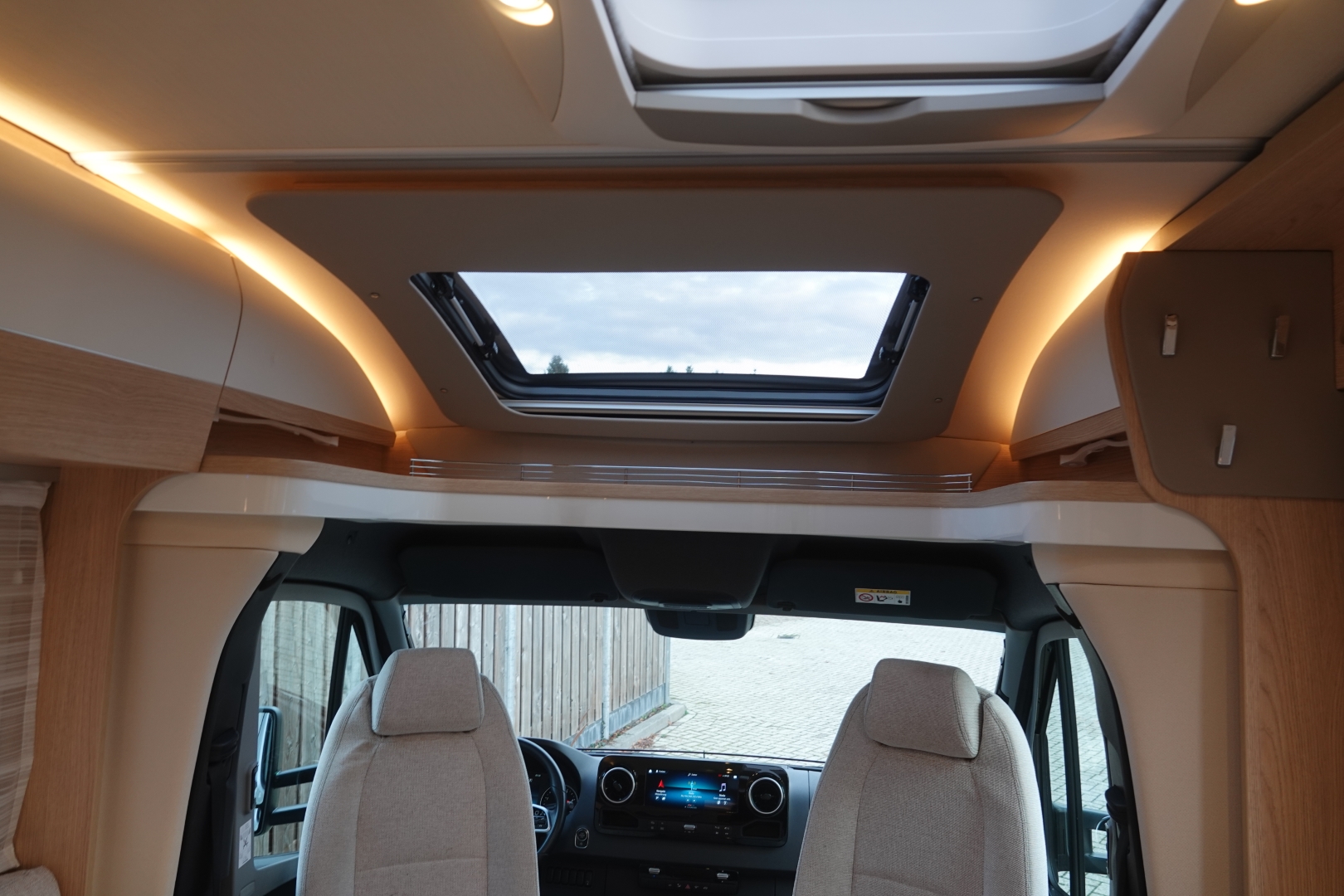 2 comfortabele pilotestoelen in hoogte verstelbaar, draaibaar naar een gezellige zitgroep met luxe salontafel en groot panoramadak er boven.